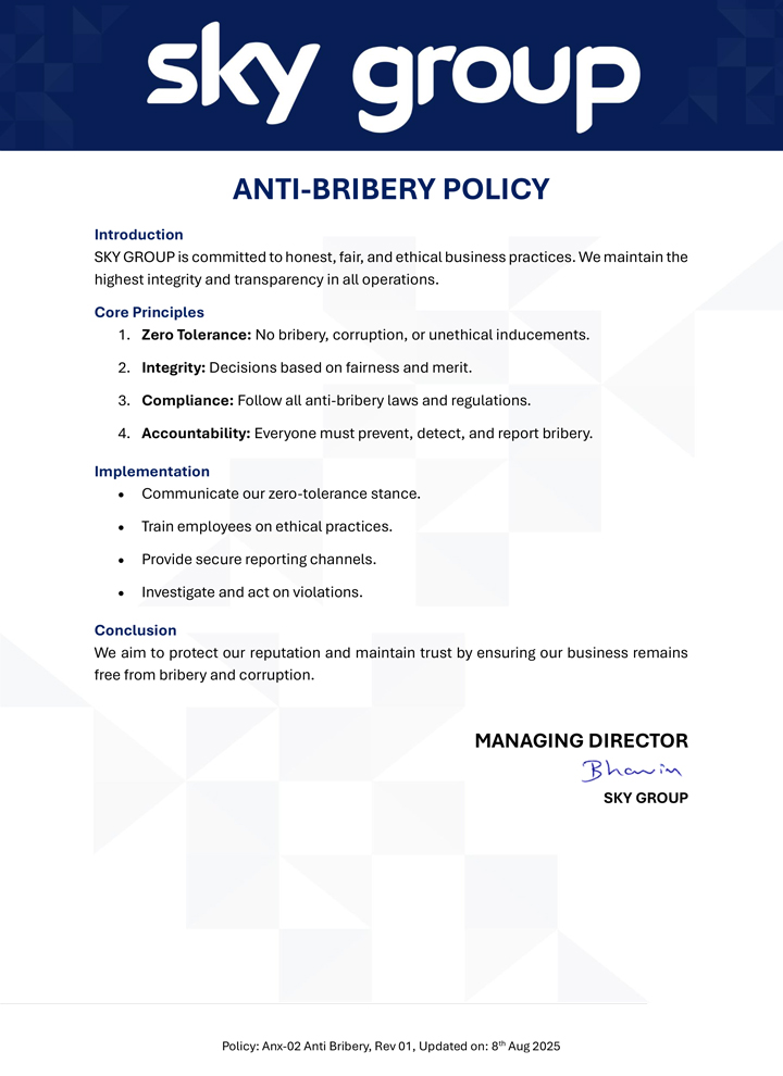 SKY GROUP is committed to honest, fair, and ethical business practices. We maintain the highest integrity and transparency in all operations.