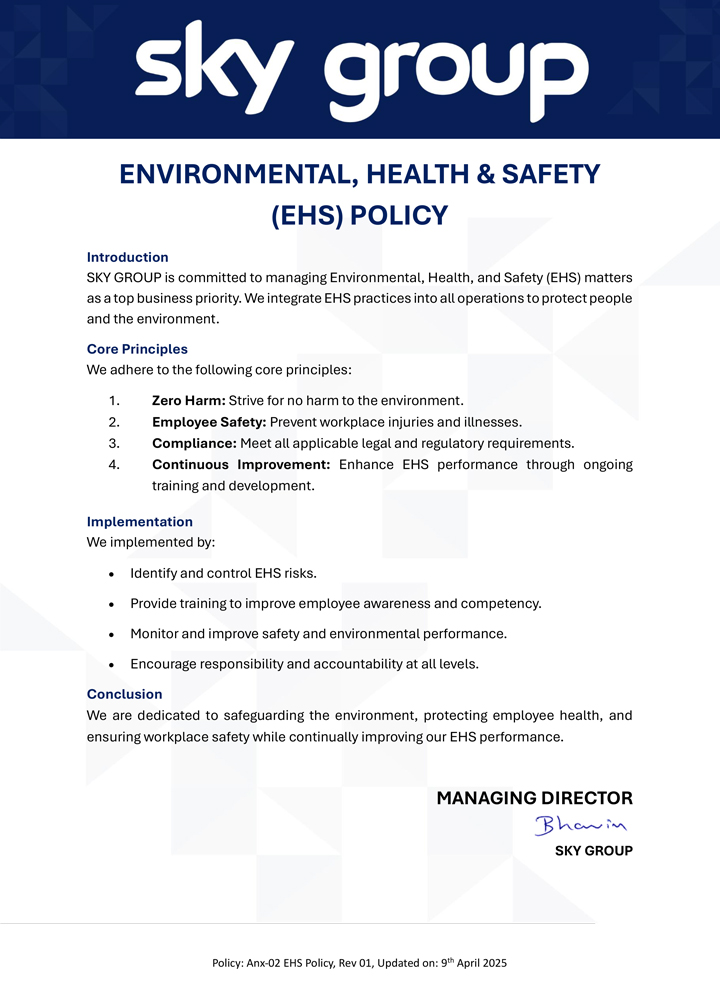 SKY GROUP is committed to managing Environmental, Health, and Safety (EHS) matters as a top business priority. We integrate EHS practices into all operations to protect people and the environment.