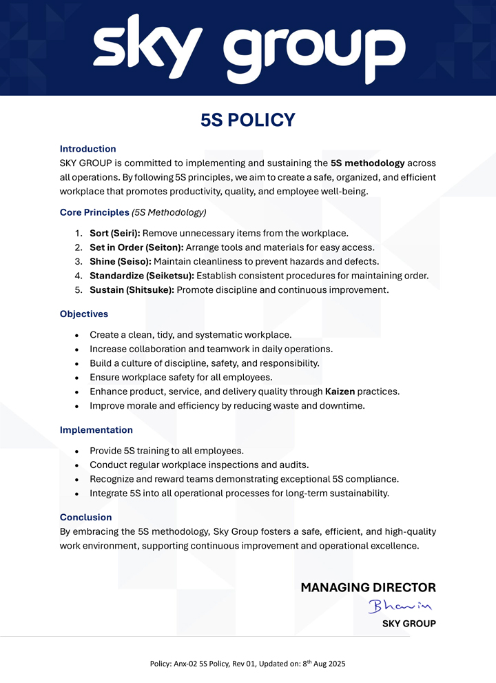 SKY GROUP is committed to implementing and sustaining the 5S methodology across all operations. By following 5S principles, we aim to create a safe, organized, and efficient workplace that promotes productivity, quality, and employee well-being.